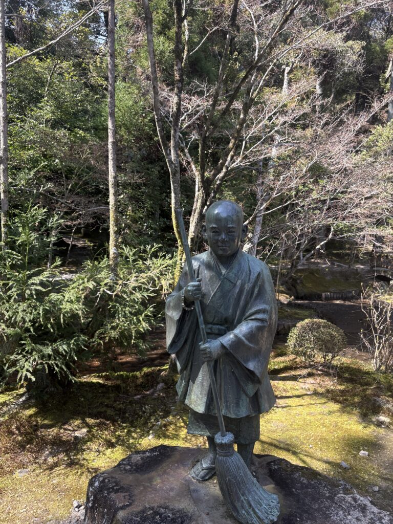 本堂の裏手に回ると、箒を手にした一休法師の銅像が静かに佇んでいた。