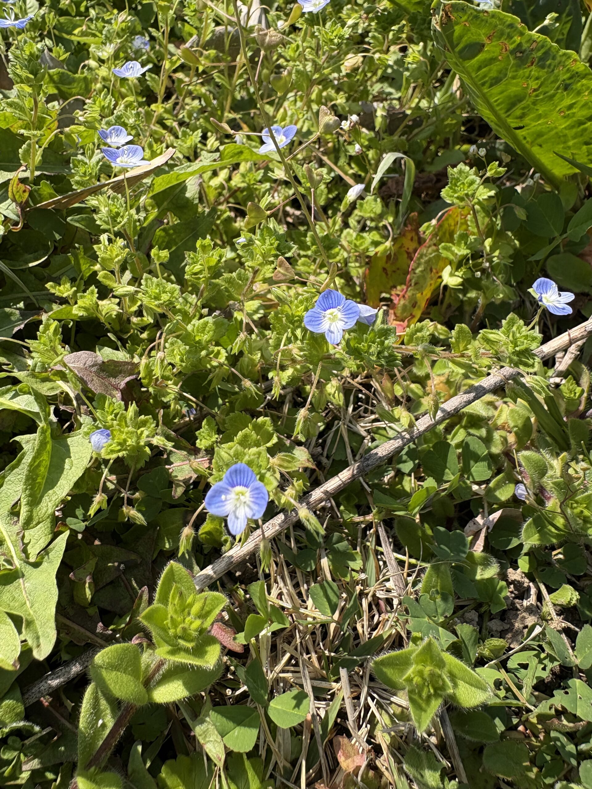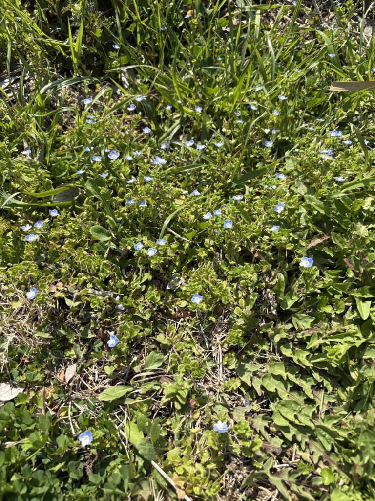 草むらに点々と咲く、鮮やかな水色の花。オオイヌノフグリだ。